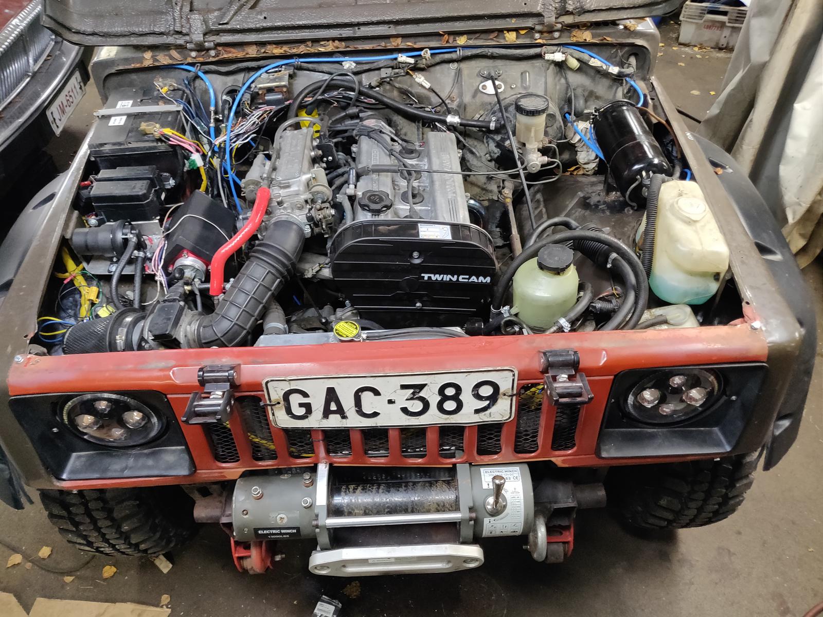 Räpistelin taakse jotain pohjaanlyöntikumin tapaista ja siirtelin jarruputket pois iskualueelta. Hitsasin akseliputkeen vasteen, että kartion muotoinen kumi vastaa johonkin tasaiseen pintaan. Tämän askartelusession jännittävin vaihe oli kotimatkalla... Pääsin muutaman kilometrin tallilta kotiinpäin, kun kojelauta lävähti niin joulukuuseksi kuin tuommoinen Samurain mittaristo nyt vaan voi. Melkein heti perään alkoi kuulumaan ihme vinkunaa tai vihellystä. Otin ensimmäiselle bussipysäkille sivuun ja konepeltiä nostaessa se alkoikin sitten selvitä. Apulaitehihna poikki ja kone alkoi siis keittää. Annoin tovin jäähtyä ennen kuin avasin korkkia, mutta purskautti silti kunnolla lientä geysirin lailla. Liekkö painetasku ollut jossain. Koitin vielä toisen kerran ajaa autoa eteenpäin, kun porukoille ei olisi ollut montaa kilometria, mutta ei tuolla kärsinyt kuin muutama sata metriä edetä ja alkoi viheltää taas. Seuraavan jäähdyttelyn yhteydessä vihellyksen syykin selvisi, joku letkuklemmareista sen verran löysällä, että pitä vettä, mutta paineen alla ei sitten enään. Olin niin myöhään liikkeellä, ettei kenestäkään ollut apua. Varhainen aamuyö päättyi takaisin lähtöpisteeseen ja allekirjoittanut matkasi taksilla kotiin ![]()