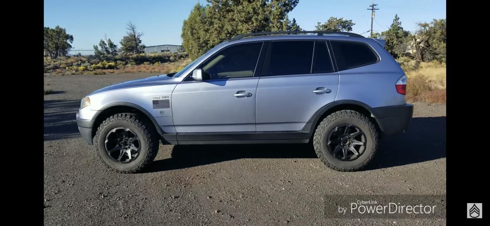 Tuossa ihan mukavan näköinen X3 itemodatulla jousituksella ja 265/70R17 renkailla (32”).