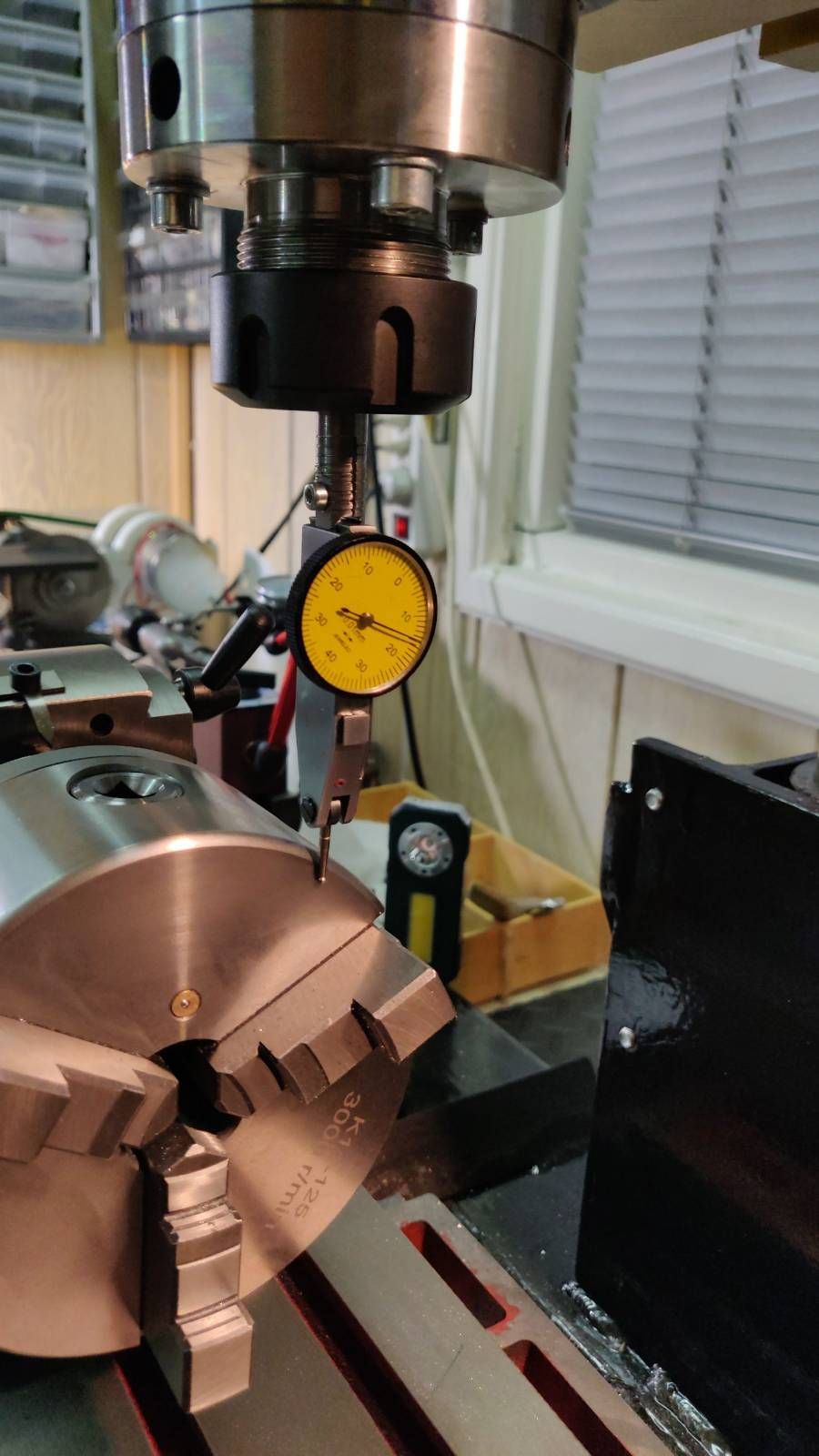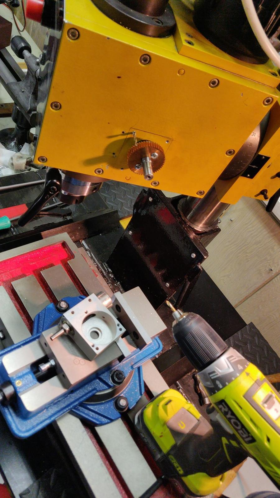 Koneen alkuperäinen Z-akselin syöttö on tolpassa oleva ruuvi minkä varassa koko kone lepää. Epäkäytännöllinen ja jäykkä käyttää. Lukitusten aukominen ja lukitseminen ei paranna tarkkuutta sekä joskus tekee omiaaan. Putoaa useamman satasen naksahtamalla. Koneessa oli myös ns. porasyöttö eli kampi kyljessä millä voi liikutella karaa alas-ylös. Hurjan sattuman kautta eteen tuli 62x49x27mm matoruuvivaihteen keskeisimmät osat eli runko ja hammaspyörät. Välityksestä ei ollut tietoa, mutta laskennan perusteella on 50:1 eli hyvin sopiva tähän käyttöön. Ei muuta kuin sovittelemaan ratasta kammen akselille ja siitähän se lähti. Ensin osa millä rattaan sai kammen akselilla olevaan tappin kiinni. Sitten matoruuvin laakerit ja niiden sovitusholkit.