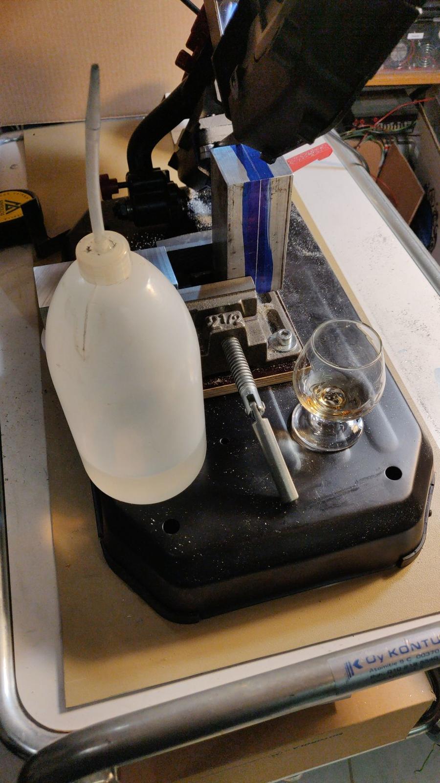 ![]() Alunperin kompoundiin tarkoitettu 200mm tanko sopikin suoraan poikittaiskelkkaan. Ylimääräiseksi jäi 420mm tanko ja kompoundiin tarvitaan 100mm liike. Ei muuta kuin tutkimaan, tuumailemaan ja keräämään rohkeutta tikun katkaisuun. Päädyn kun sai auki (liimattu kiinni) niin pääsi näkemään mittaradan rakenteen. Ensimmäinen havainto, että rakenne poikkeaa muutamista juutuubista löytyvistä lyhennystarinoista. Ei muuta kuin jyrsinkoneella katkaisupaikkaa auki ja samalla päätyä lopulliseen muotoon. Hyötypuolella lasi suojattu ja tuettu niin hyvin kun pystyy. Timanttilaikka rälläkkään ja säätömuuntajalla pyörimään suht pienillä kierroksilla. Varovasti sitten leikkaamaan. Hyötypuoli meni hyvin, jättöpuolelta lohkes hallitsemattomasti, mutta ei kaukaa. Vaikka on "vain" 5um keppi niin onhan tiheä kuvio lasissa. Ei meinaa oma mikroskooppi riittää sen tutkimiseen. Lyhennyshän onnistui. Vähän joutui jyrsinkoneella modaamaan päätykappaletta kun mittasauva ylettyi ihan rungon päähän asti. |