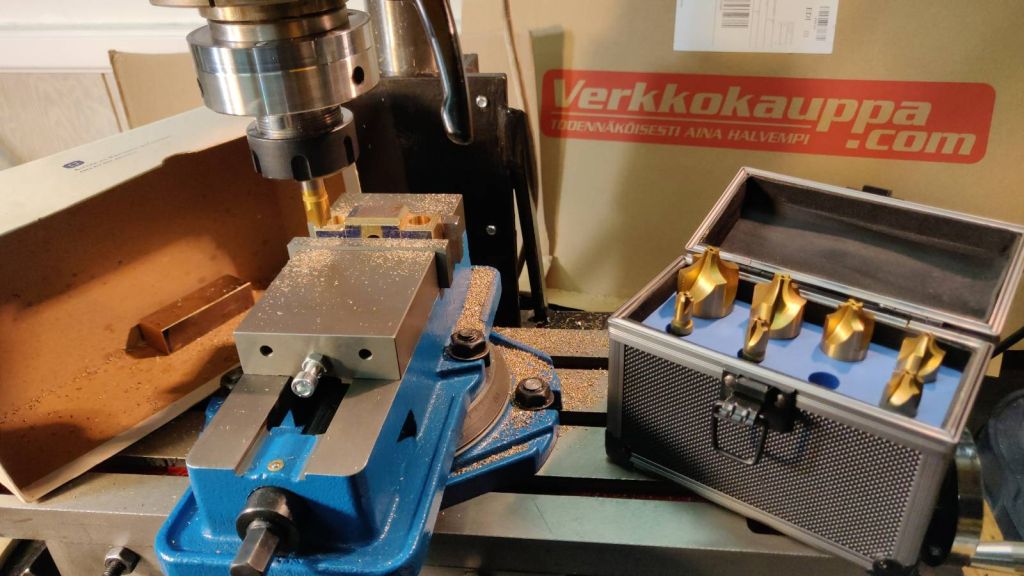 Vetomutteri syntyi messinkiklunssista. Siinä pääsi kokeilemaan uusia työkaluja. Ruuvin senkkausjyrsimiä ja pyöristysryrsimiä. Hieno osa tuli, mutta mitoitus meni millillä pieleen kun ei huomannut, että X-pöytä on kupera alapinnaltaan. Vetomutterissa ei ainakaan toistaiseksi ole välyksen säätöä. Aika näyttää tarvitaanko tällaista ominaisuutta. |