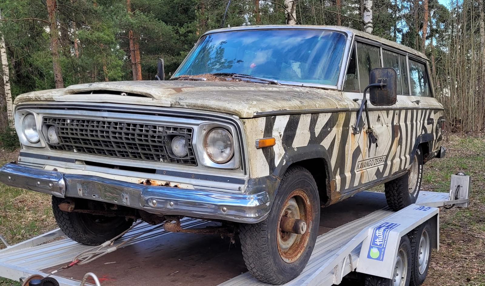 Jeep Wagoneer -78Eksyi pihan tuommoinen wagoneeri, vanha SA auto ja tuotu ulkomailta? Ainakin yksi edeltävistä omistajista kehui, että namibiassa ollut käytössä. Joskus ysärillä maalattu seepra kuvio, tyylikäs kokonaisuus siis. Mätää on runsaasti, aika pahasti päässyt pehmenemään osa koteloista samoin takaluukku, kuskin lattiasta tietoakaan ja niin edelleen. Moottori ainakin käy pullo bensalla, jarrut jumissa yms. Korin täytyisi nostaa pois rungolta ja katsoa mitä tästä kannattaa tehdä, tieliikenteeseen kyllä kiinnostaisi saada takaisin. Tekniikkana 4.2l suora 6 ja laatikko kolmelovinen manuaali, en kyllä vielä tielle päässyt kokeilemaan kun jarruja ei ole. Diiselöinti voisi olla mahdollinen mikä taitaa vielä onnistua poikkeusluvalla. Valmetti tai joku fiat kuorma-auto moottori, sekä joku järkevämpi laatikko kiinnostaa jos jollain semmoinen tekniikka on jemmassa? Tuo bensakone ei itseä niin sytytä jos jollain sellaiselle on tarvetta niin täältä semmoinen löytyy, tai vaikka koko autolle Auton rekisteritiedoissa luki jarrulliseksi vetomassaksi 5900kg?? Taitaa olla tullut kirjoitusvirhe vaikka se trafin sivuilla lukee, vai onko armeijan autoilla saanut jotain kranaatinheitintä vedellä? Päivittelen tänne kun etenee ja mitä autolle tulee tehtyä. Yksi projekti ainakin on vielä ennen hitsattavaa ennen kuin tähän on aikaa sen suuremmin käydä käsiksi