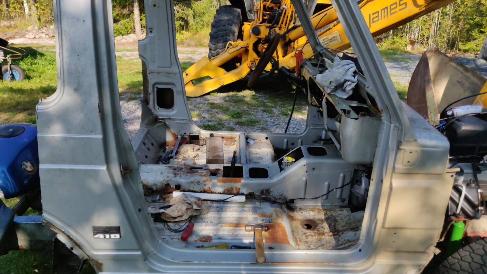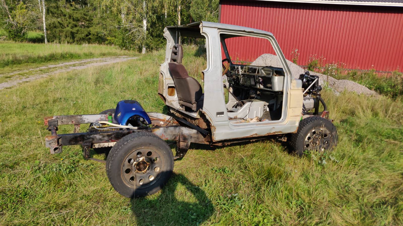 Aarrelaarin kätköistä sopiva penkki (taitaa olla Maken Samuraista) ja asennus. Senverran pehmee hytti, että penkin kiinityspisteet ei ollu enää ihan mitoissaan. No pientä hienosäätöä. Kaiken aherruksen jälkeen se jännittävä hetki lähestyi. Uskaltaako lähteä koeajolle? Jarruja kun ei vielä ole niin kaasupolkimen liike rajoitettu noin puoleen.