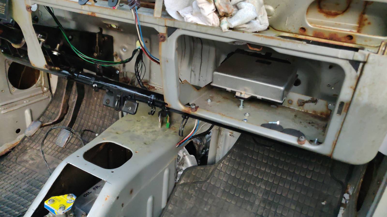 Sähkölaitteiden osasijoittelun määräsi lähinnä Bemarin johtosarja. Kaikki kama kannattaisi tietysti sijoittaa hytin puolelle, mutta ei jaksanut ainakaanan tässä vaiheessa tekemään uutta johtosarjaa. No jotain osia kuten ruiskun aivot pääsi kabiinin puolelle.