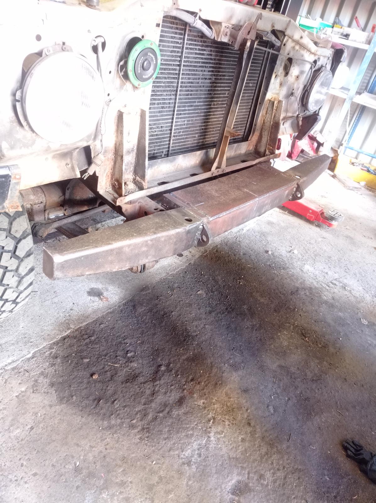Ajattelin että mikäli tuohon nyt laittaa vielä sen raudan suojaamaan valoja ja maskia, mikäli ajaa vaikka kauriin yli, niin se rauta voisi olla irroitettava. Meinasin että kiinnitys voisi olla tuommoin M20 pultti, joka tulee puskurista läpi alhaalta päin ja putken suulle on hitsattu mutteri...