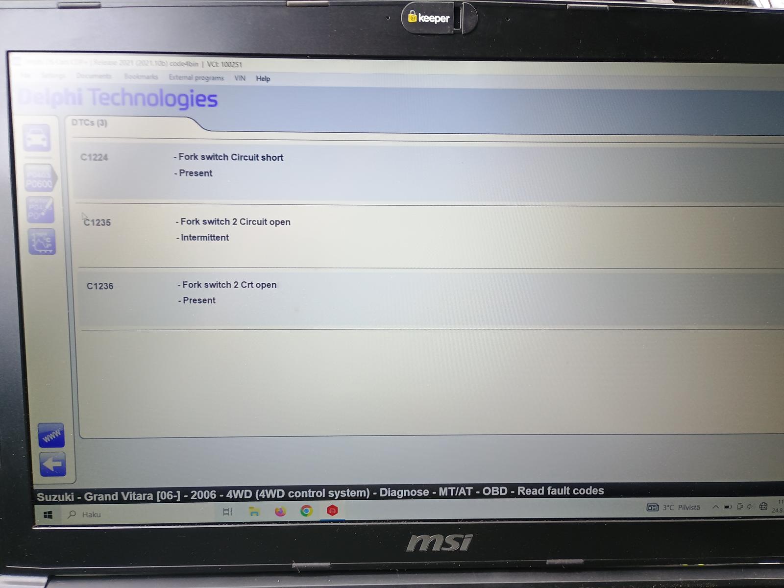 |   Suzuki grand vitara mk2 2.0 bensa, 4wd ongelmaMorjens, vähän kaipailtaisiin tulitukea, elikkäs tuli haettua 4wd vikainen 2006vuotinen bensa grandi, mittaristossa vilkkuu kaikki 3 nelivetoon liittyvää valoa sekä ärsyttävä varoitus piippaus. Vikakoodeja luettuna tulee 3 eri koodia, c1224 ja c1236 aktiivisena ja c1235 ajoittain. Käytin transfer casen actuaattorin sähkömoottorin persiin auki ja sieltä ei löytynyt vettä eikä ruoste paskaa, mielestäni tippui pieni hiilen palanen, mutta moottori pyörii nätisti käsin pyöritellen. Autosta kuulostellen 4wd valitsinta käytettäessä ei missään kohtaa tapahdu mitään actuaattorin käyttöön liittyvää käyttö ääntä. Nyt live dataa tutkiessa tulee kuvan kaltaista tietoa, 4L switch kokoajan off Actuator position sensor off, välillä vilahtaa 4x4 high range lock Differential lock center kokoajan off mode switch N asennossa ainoastaan on tilassa, muissa asennoissa näkyy off. Ei minkään valtakunnan kokemusta vastaavsta laitteesta ennen tätä hetkeä, joten jos jotain ajatuksia tai tietoa löytyy niin kaikki kelpaa, kiitos Edittinä; Tarkastin vielä livedatasta että kytkimen asentokytkin toimii, pitäisi kaiketi kytkin pohjassa kerran vaihdella modea.