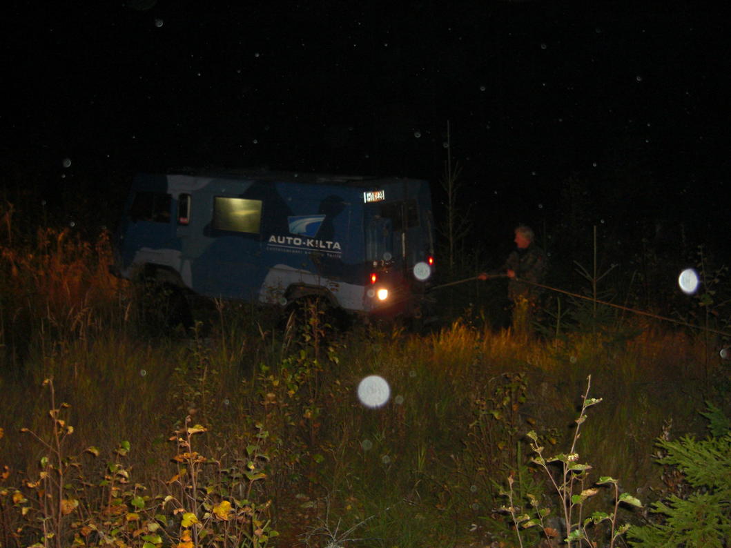 Sitten alkoikin sellaiset puuhastelut pehmeällä niityllä että kaikki eivät leiriin selvinneetkään. Pehmeillä peltosaroilla tahkottiin suuntaan jos toiseen niin kauan että volvo kalusto oli maksimijumissa. Kahta autoa lukuunottamatta kaikki selvisi leiriin ennen valoisaa. Fabritiuksen mäyriksestä antautui kytkin suolle ja etuvinssikin hajosi. Pulukin pääsi lähelle leiriä mutta apukuskien hyydyttyä auto jätettiin siihen odottamaan päivänvaloa. Aamulla löytyi älyttömän helppo reitti kytkinvikaisen mäyriksen luo joka pelastettiin suosta hiluksin takavinssin ja volvon oman korjatun etuvinssin avustuksella. |