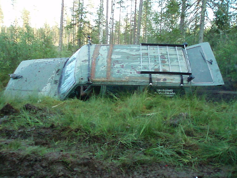 auto liian tiukalla ja muutama ruuvi löysällä (2 vinssistä ja loput kuskilta)..repes korvakkeesta irti ja tipahti pohjaan..