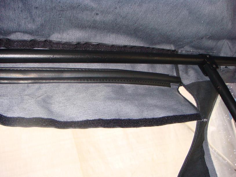 Tässä on kangaskaton sivut nostettu ylös rullalle, muuten hyvä ratkaisu mutta ajossa tuppaa pakokaasut kiertämään aika lailla.