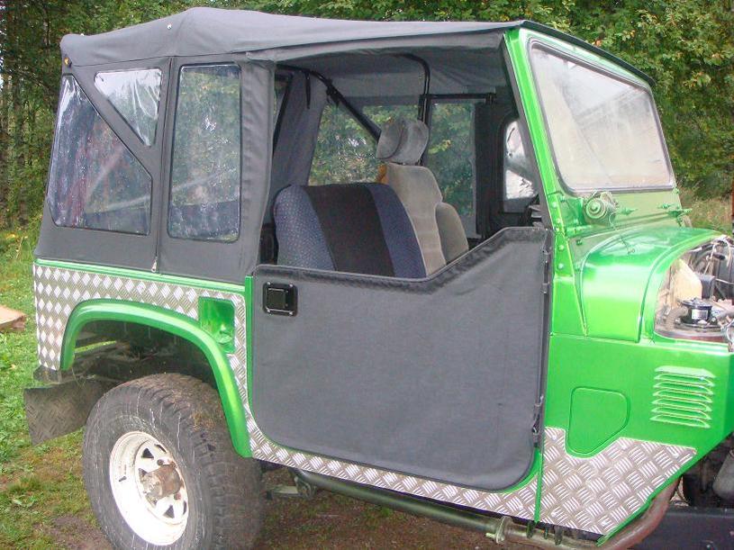 Kiitoksia vaan! Tuo katto on SuperTop nimellä ja ilmeisesti ero TigerToppiin on ainakin juuri noissa neppareissa. Tässähän on "Patented Belt-Rail™ attachment system" eli kiinnitys alasivuista ja etuikkunan yläreunasta on tuollaisella muovilirpakkeella. Muistaakseni kun noita kattoja kyselin niin tuota TigerToppia ei oikein enään saanut (ei enään tehdä??) vaan tuo SuperTop oli ainoa vaihtoehto ja ovet oli hankittava myös erikseen. Tuossa saa tosiaan rullailtua sivut ylös ja takaikkunan voi irroittaa vetoketjulla, eli ihan mukavasti muunneltavuutta. Väri on nimeltään Black Denim, eli materiaali on hieman farkkukangasmaista.
