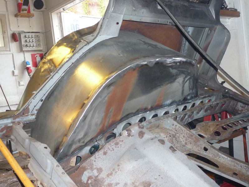 Toinen takapyöränkotelo muotoutunut uudestaan, mutta pientä sipistelyä on vielä että saa takapenkit ja muut osat mahtumaan. Oikeanpuolen kulkilevikkeetkin karkeasti muodossaan.