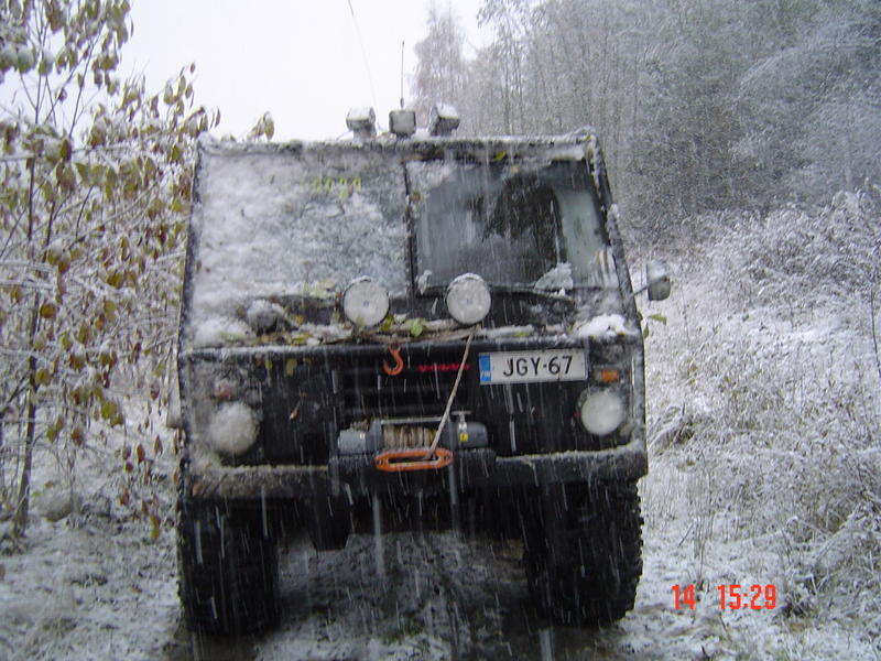 Kahautettiin Värtsilään ja tankkaamaan erikoiseen paikkaan jossa oli täysi palvelu. Kuulemma parhaan laatuista ainetta kun myy suomalaisille metsäkoneurakoitsijoille. Jänismäellä käytiin kaupassa ja syömässä hampurilaset. Sitten aloitettiinkin matka kohti ekaa pätkää jonka läheisyydestä oli tarkoitus löytää leiripaikka. Pätkä oli Ladoga 2010 SS8 Petsevara hills eli tutummin Pötsövaara. Oltiin jo mestoilla noin klo 18. Aikamme räppäiltiin kohti S16 eli starttia kunnes vastaan tuli Lada. Ihmettelimme kun ei ihan ladalla ollut ajettavissa reitti. No sinne löytykin sitten oikopolku. Ei kuitenkaan jääty sinne kostealle niitylle vaan palattiin jo aiemiin löydetylle isolle soramontulle jossa oli laaja tasainen alue ja hienoa hiekkaa. Muu porukka oli jäljessä meitä joten Jonetzun kanssa kahdestaan pidettiin leiriä kunnes pääosa porukasta saapui joskus yöllä ja osa vasta noin kuuden aikaan aamulla. Polttopuun etsiminen tuotti pimeässä tuskaa ja sitä jouduttiinkin hakemaan parin kilsan päästä. Ehdittin kaksi täysmittasta keloa polttamaan, jonkun katkomia pieniä mäntyjä, tuoretta koivua, matkalaukku ja maasta repimiämme kantoja ennen kuin muut saapuivat. Aamulla lähdettiin tahkoamaan SS8 pitkin. Possujuna ja väihköstiimi nolla unilla matkaan. Ekat jumitukset UglyHJ Offroadjouni ja Laalaa navigoi Mäen laskua Räkytäky Possujuna Laskeuduttiinkin melkoisen pehmeään maastoon ja vinssaustalkoot alkoivat. Meinas alkaa harmittamaan kun takalukko ei toiminut vaan päästi paineet perän sisään ja eteneminen oli tuskaista. UglyHJ pääsi taas vinssailemaan kun ensin suoritti pikkupulttiremontin. Porsaan polku Matoruuvikelain vetää eleettömästi Vinssailun jälkeen reitti koukkasi hiekkatieltä helvetin jyrkkään ja pitkään mäkeen. Todella hauska nousu. Pätkälle ei tullut kuin muutama auto ja loput oikaisi tien kautta. Mäen päällä olikin pirullisen ahdasta puun pujottelua ja Joppa katkaisi sinne lyhyen etuvetarin. Kartasta katsoin että mäen nimi on suurvaara ja vieressä numerot 130,1 jotka ehkä kertovat jotain korkeuteen liityvää. Jeeppi mäen alkuvaiheessa Reitti päättyi Harlun kylään mutta jätimme loppupätkän ajamatta ja oikaisimme hiekkatiellä joka tuli Harlun kyltin kohdalle. Samaan paikkaan jossa LT 2010 oltiin pätkää katsomassa toisella huoltoautolla. Ajettiin siitä sitten Harlun kylille etsimään jänisjoen ylitystä. Aikamme pyörittiin Tiilitehtaan, Sahan ja Leppäkosken paperitehtaan tienoilla kunnes löydettiin pato josta pääsi yli. Kartan mukaan tässä joessa useita koskia. Tästä sitten jytyytettiin paussun, Pirskan ja Kokkoselän kautta Satisenjärvelle josta löytyi mainio leiripaikka rannasta. Oli laiturikin tehty ja näytti olevan aivan hienoa hiekkaa pohja. Kesällä varmaan mainio leiripaikka. Simppa tuo keloa auton alla. Iironsika puutöissä Jopan vetariremontissa ei palella Chromo longfield kestää mutta vakiotikku ei. Jonetzu haastaa väihkösen juomakilpailuun jonka jälkiseuraukset valvottavat kaikkia lähes koko yön. Myös Ilkka ja Antti saapuvat leiriin yöllä Uazillaan. Vaakaa yritetään Vetoakselin lämpökäsittelyä Aamulla aloitettiin matka kohti vesiputouksia joille linnuntietä matkaa nelisen kilometriä Aamunotskilla Matkanjohtajan aamunavaus Matka alkoi kohtullista spooria pitkin Pikkusika ja Olppa Rahtari jussukka viihtyi mäyriksen puikoissa Olppa ja Appari Ryhmäpotretti. Kamera jo vetänyt taas kosteuden sisään ja siitä sumureunaefektit. Matkalla hiluxin rengas meinasi irrota kun spacerin tai pyörän pultit finaalissa. Sitten saavuttiin vesiputouksille ja aikammen sitä ihailtua päätettiin rytkästä alas jokeen ja ajaa reitti vastakarvaan. Siinä se vihdoin on. Tästä on puhuttu vuosia että täällä vielä käydään. Ja sitten vaan hitosti kuvia todisteeksi. Jeeper Maajussi Pensa Jeepit Pari myyntikuvaa räkytäkystä Kun kuvat oli otettu jatkettiin jokea pitkin eteenpäin. Nyt vesi oli älyttömän matalalla mutta silti tässä oli yksi syvempi kohta. Joessa laitoin taka arbin päälle kun ajattelin sen paineistavan perää vaikka se läpi vuosikin. Ihmeekseni arbbi alkoikin pienen vuotamisen jälkeen toimimaan ja loppumatkan se toimi kohtuullisesti ainoastaan välillä vuotaen. Yllätys olikin suuri kun täältä löytyi toinen pienempi putous Putouksen vieressä oli hauska pitkä mäennousu jota sai tahkota tosissaan. Lopussa oli tosi tarkka paikka puiden välistä. Ile tietty ajoi päin puuta ja puskuri painui rengasta vasten. Väihkönen mäessä volvon vinssauksessa Yöllistä jumittelua Erään pehmeän suon jälkimainingeissa Ugly räjäytti aidon CHROMO LONGFIELD murroksen. En ollut tätä uskoa ja vedonlyönnissä hävisin Väihköselle pullon diplomaattia. Myös Jannen vinssi oireili kipinöimällä ja tarkempi tutkailu paljasti että hiilisilta hieman sulanut ja ankkurista irronnut pätkä käämiä. Vaihdettiin sitten mun takavinssistä moottori tilalle ja sen toimimattomuutta sitten turkittiin seuraava tunti kunnes huomattiin että yksi laakeri oli unohtunut. Leiriin jäätiin hiekkatien lenkkiin. Jossa vietettiin railakasta leirielämää. Matkalla Jopalta katkesi sitten ne etunavan pyöränpultitkin. Aamu alkoi yllättäen remontilla Ajettiin sitten tankille mutta päätettiin olla lähtemättä pirunpeltoon koska tällä kelillä ja tällä letkalla aika ja varaosat loppuisivat varmasti kesken. Juuri parahiksi kun päästiin asfalttibaanalle ilmeisesti bertta tiputti patrolin satulasta takaa palat ulos ja männän pihalle. No jarru ohitettiin helposti huoltsikan pihassa. Päätettiin sitten lähteä kohti rajaa etsimään jotain ajettavaa. Paikoin oli lunta reilusti. Monta kertaa säikäytti kun puusta putos lunta ja jäätä lasikuitukatolle. Bertta kehyksissä Matkan varrelta Varmasti suomalaisten tekemään tukkitien pohjaa Liuskekivestä tehty jonkun navetan raunio. Eloselkä oli paikan nimi Alattu nimisessä kylässä. Paikalle johti hieno 