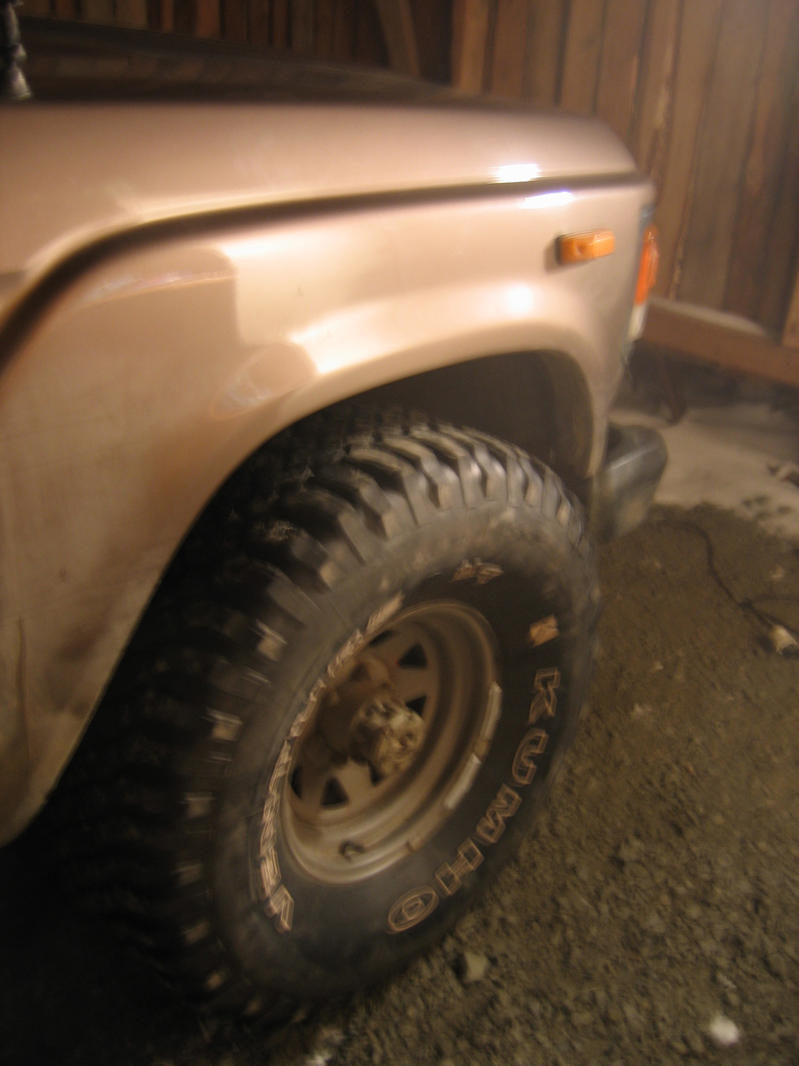 Jaksoin ottaa pari kuvaakin. Elikkäs kuvissa näkuu rassi, joka on tarkoitus pistää sekakäyttökuntoon. Ensimäisenä hommana tuli nyt hankittua nuo riittävän isot renkaat. Ensimäistä jo koeistuttelin tuohon. Näkyy kuvissa nuo vanhat ja uudet ja samalla vähän, että miltä näyttäs. Sakottaako setä poliisi tuosta renkaan ylimenosta? Tuo kulutuspinta ei varsinaisesti tule tuolta alta esille, mutta hitusen tuo reuna. Tuossa näkyy yhdessä kuvassa jotenkin. Pitääkö heti alkuun ruveta levikekumeja laittelemaan? PS. Renkaista kiitos Rompe1:lle! Edit. Nyt on koeajettu. Pitoa löytyy itse asiassa enemmän kun nuista nastoista. Tosin vetisellä jäällä voi tilanne olla toinen. Hangessa menee kivasti ja nelikko tuntuu jotenkin paremmalta vanhoihin renkaisiin verrattuna. Ainoa miinus pienestä vaeltamisesta, mutta kai siihen tottuu