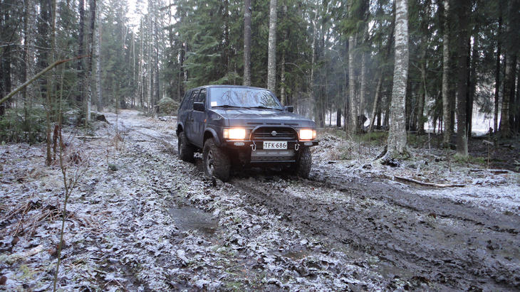 Eli tällä hetkellä alla 31" renkaat. Myöhemmiin tulossa 33" renkaat, kunhan saan jostaki ostettua korjausoppaan jolla sitten saa isommat rekisteriotteeseen. Koria nostettu 75mm. Ja taakse on tulossa +75mm korottavat jouset joulun jälkeen. Viime viikolla askartelin myös tukevamman etupuskurin, 4mm U palkista. Takapuskuri täytyy laittaa sit keväällä kun kelit lämpenee taas.