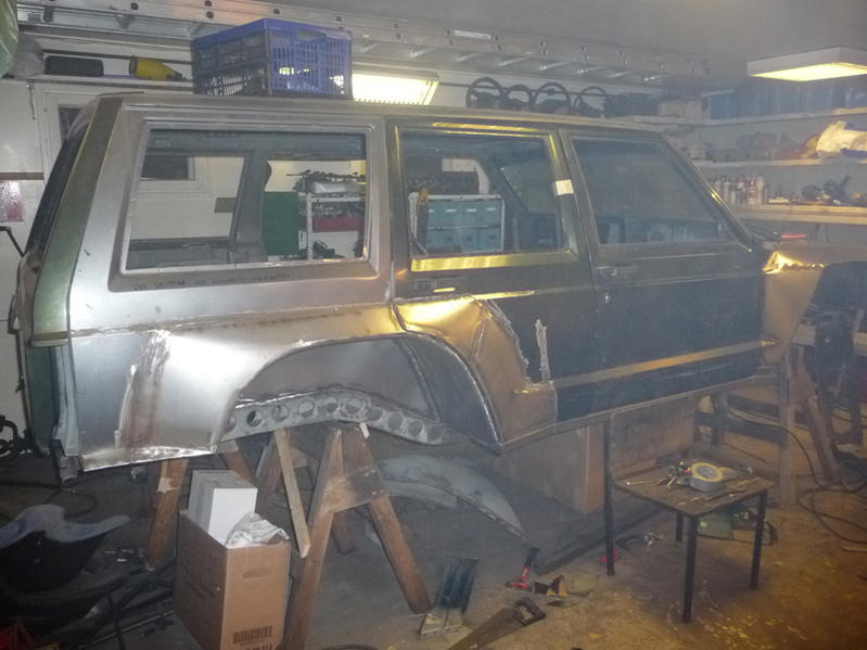 Toinen takapyöränkotelo muotoutunut uudestaan, mutta pientä sipistelyä on vielä että saa takapenkit ja muut osat mahtumaan. Oikeanpuolen kulkilevikkeetkin karkeasti muodossaan.