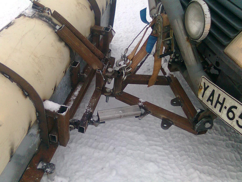 Mietin, jotta miten olisi Volvon eteen helpoin sijoittaa lumensiirtoväline ja päädyin laiskana miehenä lopulta tällaiseen