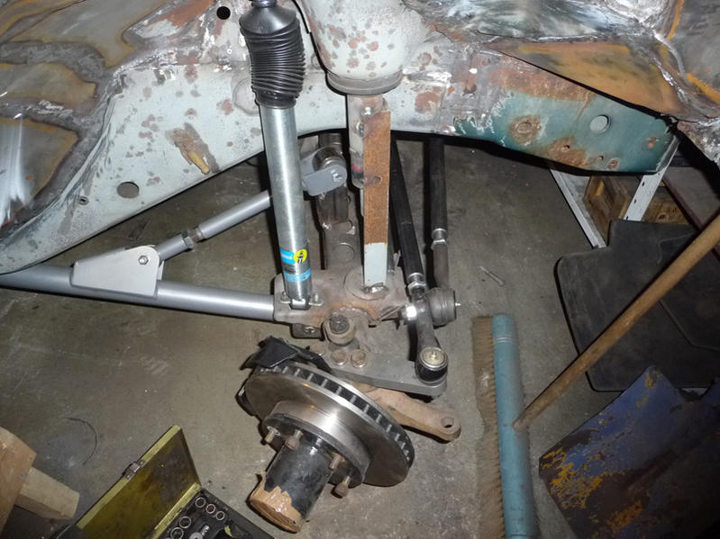 Etuakselia mallailtu paikalleen. Tukivarsien korin puoleiset korvakkeet valmiina. Täytyy suunnitella vaihteistonkannatinpalkista tuki noille tukivarrenkiinnikkeille. Uudet iskarit ei saali niin paljon sisäänjoustoa kuin entiset, mutta saattaa olla että joutuu muutenkin rajoittamaan kun rengaskokokin kasvaa parilla tuumalla. Nykyiset iskarit pisimmillään 80cm ja lyhimmillään 52cm, ulosjoustolle jää liikevaraa 42cm. High steer ohjausvarret sopii aika hyvin paikalleen mitä nyt simpukalta lähtevä varsi on hieman vinossa auton poikittaissuuntaan nähden. Kannattaisikohan vaihtaa pitman arm sellaiseen malliin joka ei pudota sitä noin alas kuin kuvissa ja siirtäisi samalla vartta taaksepäin? Oliko se niin että panhard olisi hyvä olla tuon simpukalta lähtevän varren kanssa samassa kulmassa? Kallistuksenvakaaja ei meinaa sopia millään tähän pakettiin, mutta leimasetä sen kuitenkin paikalleen vaatii