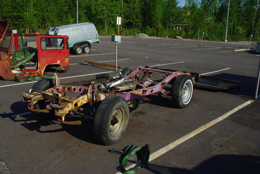 Katsos kun työpaikan parkkipaikka on ollut sellanen maiän säilytyspaikka noille meidän romuille. Nyt firmalta tuli ukaasi että romut täytyy saada pois. Niin nyt sit äkkiä tehdään noi nostohommat alta pois ja siirretään auto sitten Vääksyyn tekoon. Omassa hallissa kyllä pääosin teen kaiken mutta ku ei löydy kunnollista nosturia niin tehtiin noi kopan nostot ja muut nyt sit ihan taivasalla ![]() Näillä näkymin lokasuojat, akselit, takaikkunasivut, katto ja takaluukku (ylempi) ja vanteet on ainakin myynnissä. Tarjouksia saa esittää oman mielen mukaan.