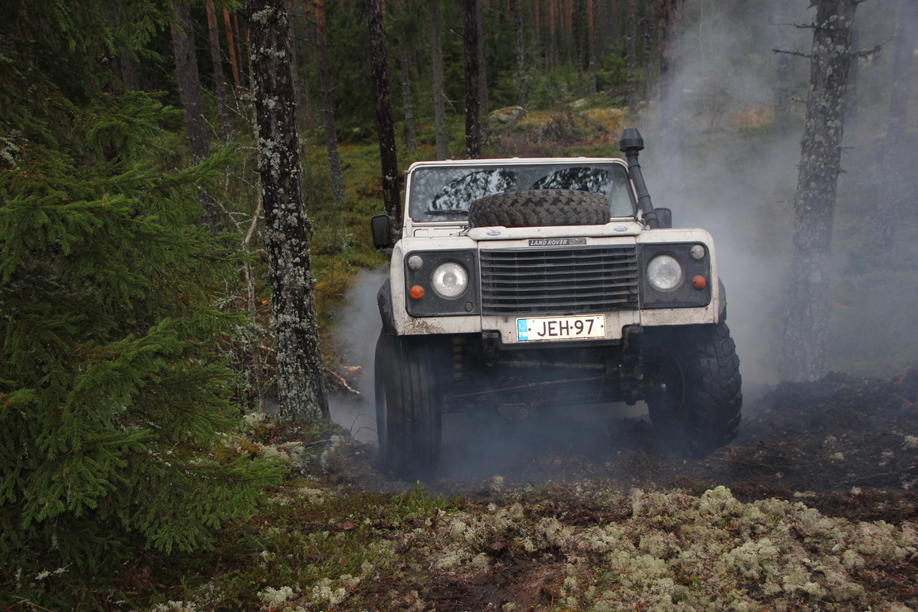 Kesällä kun valitettiin että saaristo oli vähän vaativa rakennetuillekin autoille, niin Esa sitten päätti todistaa, että snorkkelilla varustetulla vakio troopperillakin voidaan käydä siellä keskellä. Vesi oli sen verran viileää, ettei hän sinne nautiskelemaan kuitenkaan jäännyt;)