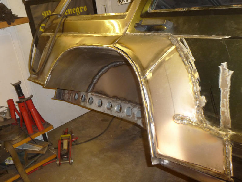 Toinen takapyöränkotelo muotoutunut uudestaan, mutta pientä sipistelyä on vielä että saa takapenkit ja muut osat mahtumaan. Oikeanpuolen kulkilevikkeetkin karkeasti muodossaan.