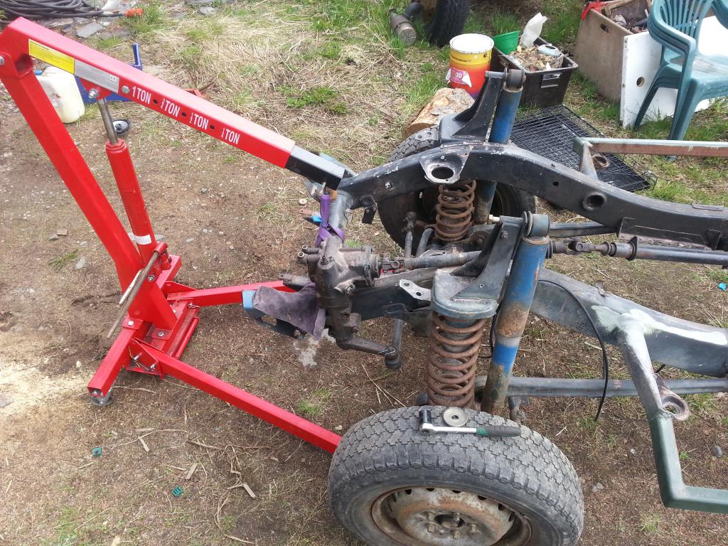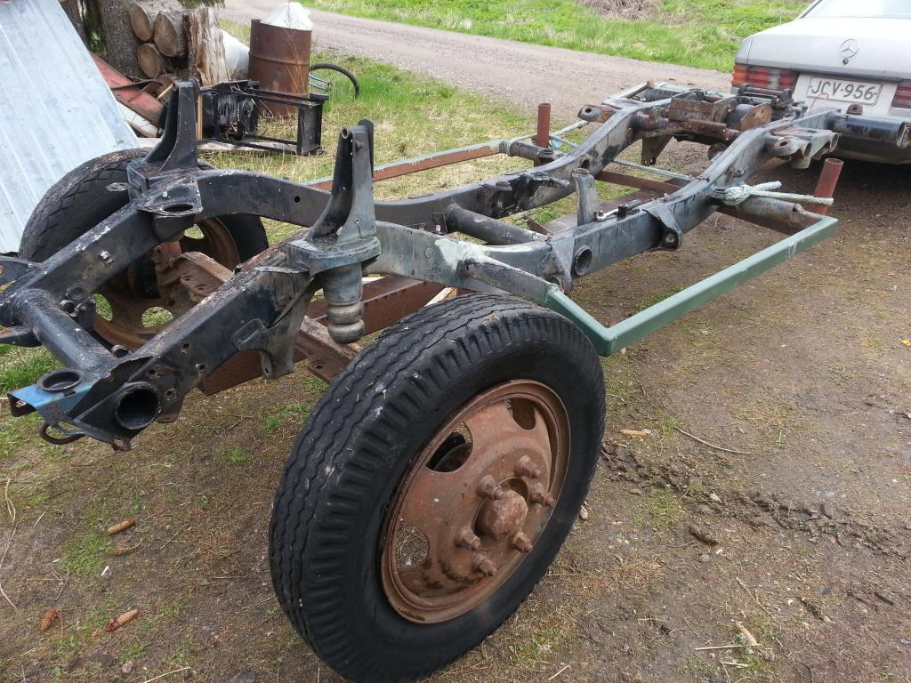 Akselit nujuttu erilleen ja runko kärrylle jonka päällä tarkoitus puhallus ja maalaus suorittaa. Tänään kuriiri kiidättää myös bilteman neulahakkurin jolla isoimmat ruosteet olisi tarkoitus irroittaa. Korjattavia ruostepaikkoja tosiaan nuo takaiskarin ja jousen korvakkeet ei juuri muuta.