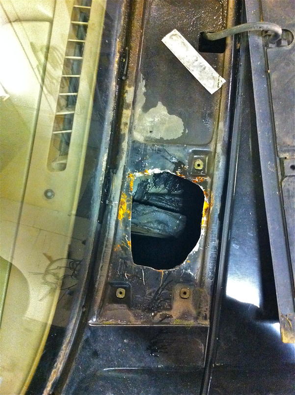 Tai sitten se vesi pääsee valumaan siitä konepellin saranan kohdasta konehuoneen puolelle-> lämppärin puhallin suoraan alla-> tiivisteen välistä suoraan jalkatilaan. Minulla tuonne kurkattu jo edellisen omistajan toimesta ja yritetty massata uusiksi karusta reijästä, mutta otin rälläkän käteen ja vetäisin koko nurkkapalan pois-> oli meleko lohduton näky, enkä ole vielä ottanut tuota kohtaa tarkempaan syyniin, mutta alla kuva tilanteesta ENNEN aukon suurentamista. |