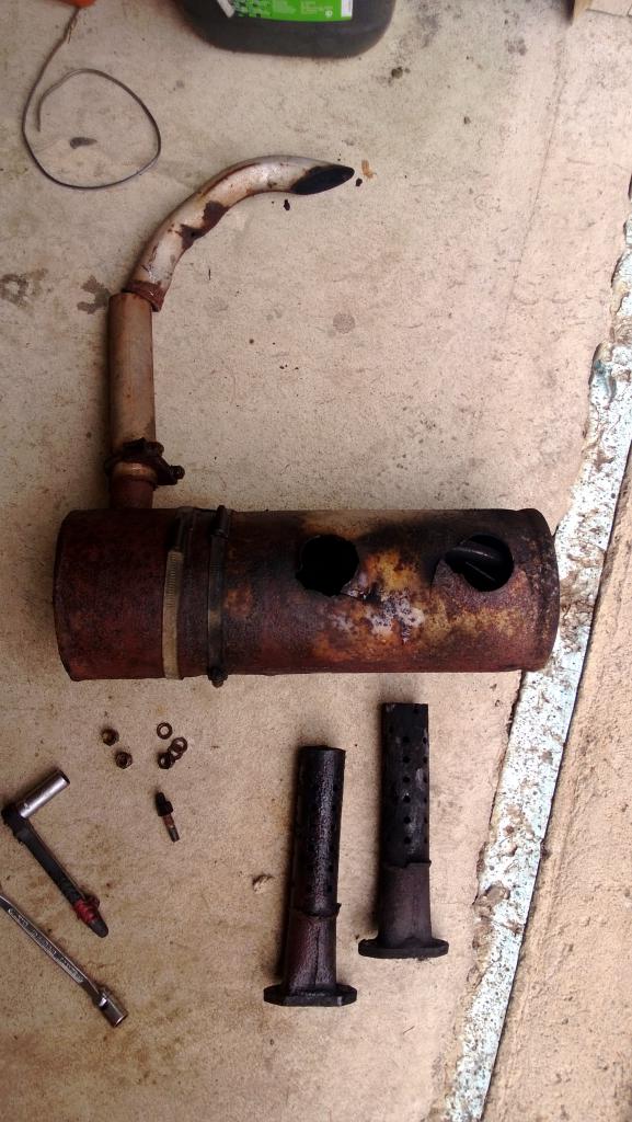 tänään tuli tuota pakosarjaa / pakoputkea vilkastua lähemmin... Eipä tuossa ollu paljon enää ehjää osaa havaittavissa. Jopa ännkkärin sisuskalut oli kaikki irtotavaraa... No ei muuta kuin kävin nappaamassa Moponetin pienimmän änkkärin mikä löytyi ja rälläkkä käteen. Tallista löytyi sopivasti yks 90 mutka joten eiku pari reikää kylkeen pakosarjaa varten, vanhat pätkät kiinni ja putken pääty umpeen. Sovitus ja änkkärin hieromista / miggiliimaamista, lopputulos: Toinen 90 mutka jäi puuttumaan jotta saa tuon pään taaksepäin, mutta olipa vähän möreämmät äänet kun risa 40mm pakari vaihtu ehyeen 60mm versioon