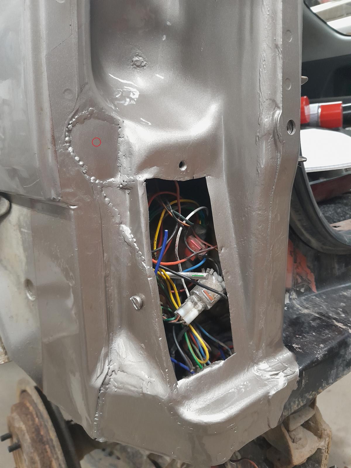 Edellä ihmettelin mistä se pyöreä reikä oli saanut alkunsa, mutta onhan siinä ollut pieni reikä alunperin, tässä kuvassa punaisen ympyrän kohdalla. Takavalon ohjuritapille. Jätin pois kun ei se sitä tarvitse. Nyt ei pitäisi pölyn ja veden tuosta aukosta mennä sisään. Kuvassa aukon keskellä näkyy M5 kierretangön pätkä, jonka heppasin lokariin kiinni. Aukon ympäri laitoin 5mm solukumitiivisteen, ja peltikannen jonka keskellä reikä johon tuo kierretappi menee. Niin ja lisäsin kunnon maadoituspisteen kun tuolla ei sellaista ollut, tuo talttapääruuvi, messinkiä. Viimeksi muokannut riude : 26.06.2023 09:55 |