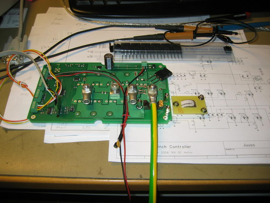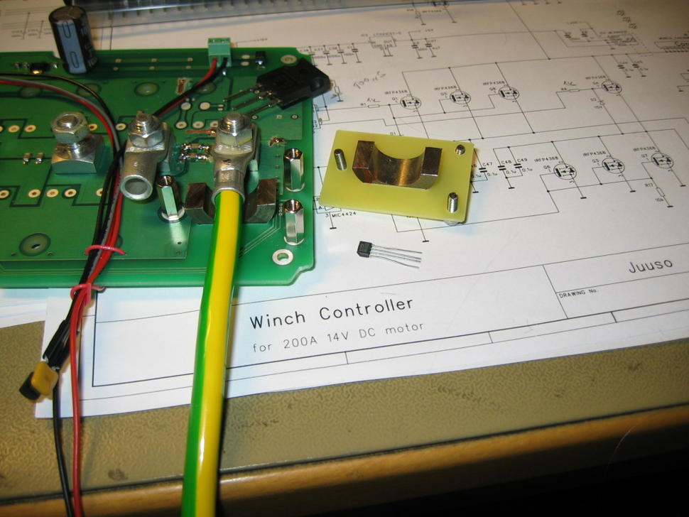 Oma mittaus on tehty open koop menetelmällä koska se on yksinkertaisempi ja tällaisessa vinssin moottorin mittaamisessa suuruusluokka ratkaisee eikä tarkkuus. Toinen hyvä peruste on, että proto on tehty siitä kamasta mitä sattuu miljoonalaatikosta löytymään. Tässä kuva kehitteillä olevasta vinssiohjaimesta. Tässä tarkempi kuva virta-anturista Nyt pitäisi vaan löytää jostain kestomagneettimoottorilla oleva vinssi testausta varten. Sarja ja Compound moottorit eivät sovellu tähän kytkentään. Sarja ja Compound koneissa suunta vaihdetaan kytkemällä kenttäkäämit eri päin suuntaa vaihdettaessa. Kestomagneettikoneessa koko moottorin napaisuus vaihdetaan suuntaa vaihdettaessa. Tässä muuten syy miksi "normaalin" vinssin ohjausreleiden kytkentä näyttää niin omituiselta. |