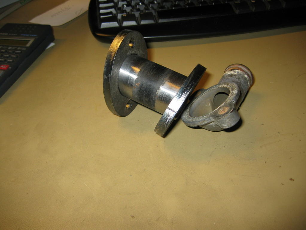 Kuten Juuso kertoi ei ole vielä hitsattu kasaan. Tässä kuitenkin pari kuvaa osasta. Teräksestä leikattu kaksi laippaa ja putki väliin. Näillä saa letkulähdön käännettyä sopivaan asentoon. Ylempään laippaan tulee M8 kiertet ja termostaatti tulee laipan ja alkuperäisen kotelon väliin.