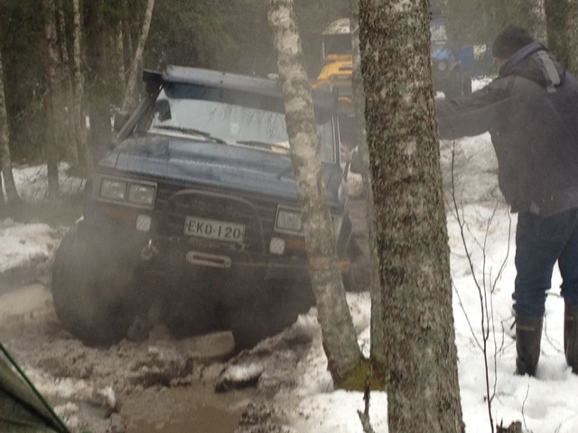 "Klo 3 aikaan leirissä. Ajettiin 2013 mudventures-reittiä aamusta ja Paalijärven ylitys oli pilattu uudella sillalla. Nyt tempokeskuksen tietämillä. Kukaan ei ole tehnyt remonttia eli vehkeet on kestäneet hyvin. " "Edellinen lähetys vähän kesti kun ei ollut kenttää. Nyt mutasafarireitillä eksyksissä ja leiri pystyssä. " "Lunta on paikoitellen puoli metriä... "