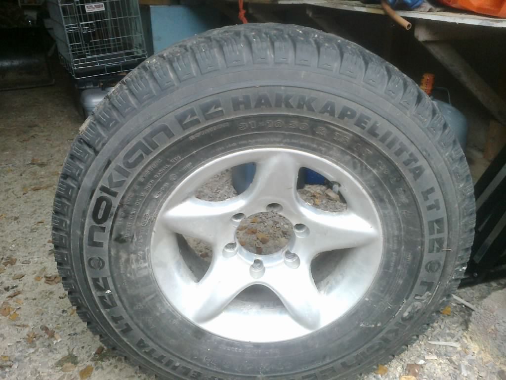 Mulla ois ylimääräsenä Nokia Hakkapeliitat 31x10,5x15 alumiinivalssilla. Renkailla ajettu n. 2000 km. Olleet gen 2 Pajerossa.