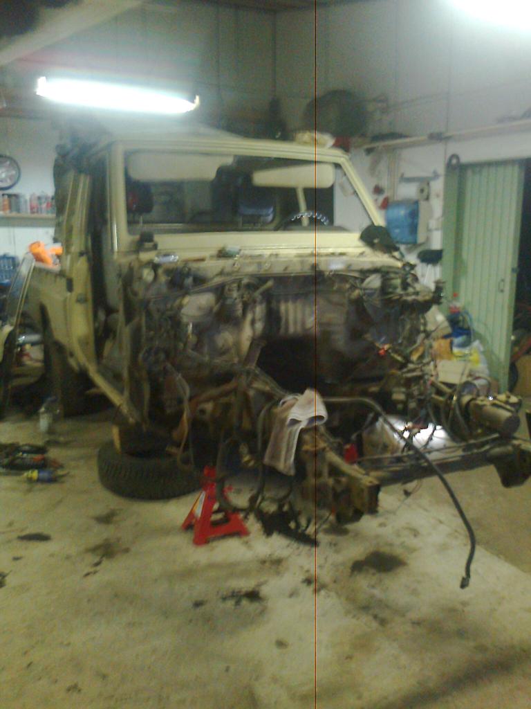 Ensmäinen homma oli saada vehje takas pyörilleen että sai sen siirrettyä tallille. Muutaman tunnin lauantai päivällä vesisateessa kun ahersi ni se olt liikuteltavis ja sai soittaa hinurin hakemaan. Tallille kun oli auto saatu ni alkoi purkaminen ja vaurioiden kartottaminen, että kannattaako alkaa korjaamaan vai pistetäänkö osina myyntiin. Etuakseli menis uusiks, vaihdelaatikko poikki, ja etupään peltejä. Muuten näytti hyvältä, ja runkoakin siinä tuli mittailtua.