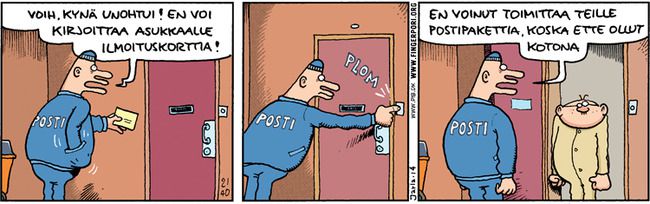 Posti osaa kyllä tanskasta tulevan paketin seurannan kaappasivat ja vieläkään perillä seurantanumerolla ainoa ongelma että kyseinen paketti jo ollut viime keskiviikosta autotallilla toisen kuljetusliikkeen tuomana , kuskikin ihmetteli mitä se posti sekaantunut koko lähetykseen   Taloyhtiön kiertokapulanlaskun karhukirje saapuu perille ennen varsinaista laskua. Saa kuulemma korot ja viivästysmaksun takaisin tekemällä valituksen postille tuskin asia etenisi kun palvelupuhelinnumerot ja muut esteet. 12€ takia jaksa taistella mutta olisihan se kiva laskunkin saada ennen eräpäivää eikä karjukirjettä alkajaisiksi. |