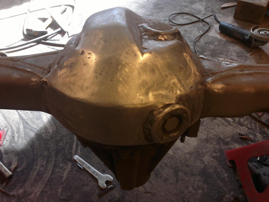 eli mutteri hitsattu sopivaan reikään ja pultti katkottu sopivan mittaseks + kupariprikka tiivisteeks: Sitten nappasin vanhasta peränkuoresta propun uusiokäyttöön, samoten G mersun takapanhardin toisen pään, porasin perän alapuolelle reiän ja hitsasin kahtapuolta 'putken' banjoon ja vanha proppu sen sisälle suojaan. Nyt ois taas tyhjennysproppukin mistä saa ainakin enimmät peräöljyt ulos. Saumasta tuli kyllä paljon tasasempi kuin mitä kuva näyttää ja hitsattu molemmin puolin joten luulis että pitää... Viimisenä tuli tekastua tuosta takaperän pinionin laipasta ns. double drilled version eli nyt siitä löytyy oikea jako myös tuolle sovitinlaipalle.Ens viikolla jos kävis vaihtamassa migin pullon täyteen niin vois hitsata tuon putkipäädyn paikoilleen ja pääsis miettimään alapuolen panssaria/materiaalin lisäystä että kestää hieroa eikä mee puhki ihan heti... Viimeksi muokannut mparty : 20.04.2013 18:21 |