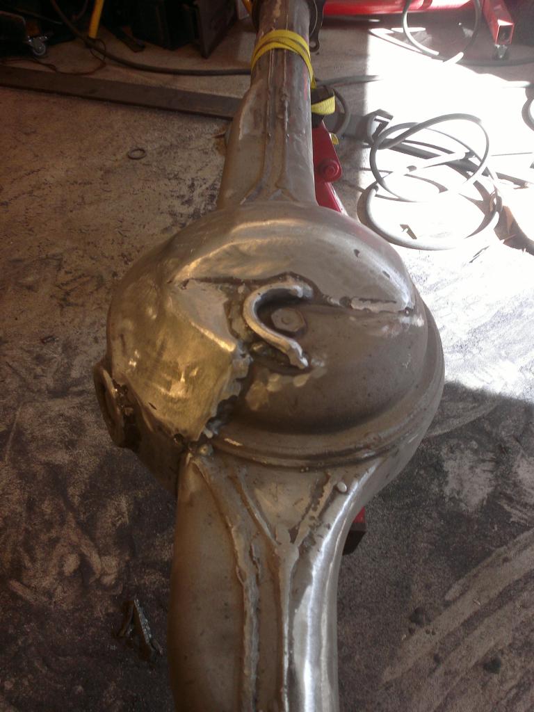 eli mutteri hitsattu sopivaan reikään ja pultti katkottu sopivan mittaseks + kupariprikka tiivisteeks: Sitten nappasin vanhasta peränkuoresta propun uusiokäyttöön, samoten G mersun takapanhardin toisen pään, porasin perän alapuolelle reiän ja hitsasin kahtapuolta 'putken' banjoon ja vanha proppu sen sisälle suojaan. Nyt ois taas tyhjennysproppukin mistä saa ainakin enimmät peräöljyt ulos. Saumasta tuli kyllä paljon tasasempi kuin mitä kuva näyttää ja hitsattu molemmin puolin joten luulis että pitää... Viimisenä tuli tekastua tuosta takaperän pinionin laipasta ns. double drilled version eli nyt siitä löytyy oikea jako myös tuolle sovitinlaipalle.Ens viikolla jos kävis vaihtamassa migin pullon täyteen niin vois hitsata tuon putkipäädyn paikoilleen ja pääsis miettimään alapuolen panssaria/materiaalin lisäystä että kestää hieroa eikä mee puhki ihan heti... Viimeksi muokannut mparty : 20.04.2013 18:21 |