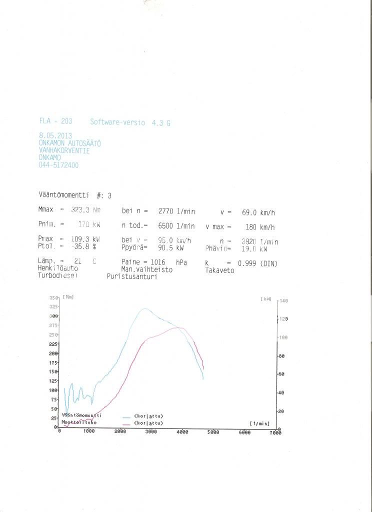 No mut eihän tuo huono oo, eikös tos alunperin oo 70 kW, nyt yli 50% enemmän. Eli vallan onnistunu viritys. Vääntöpiikki tosin yllättävän korkeilla kiepeillä.