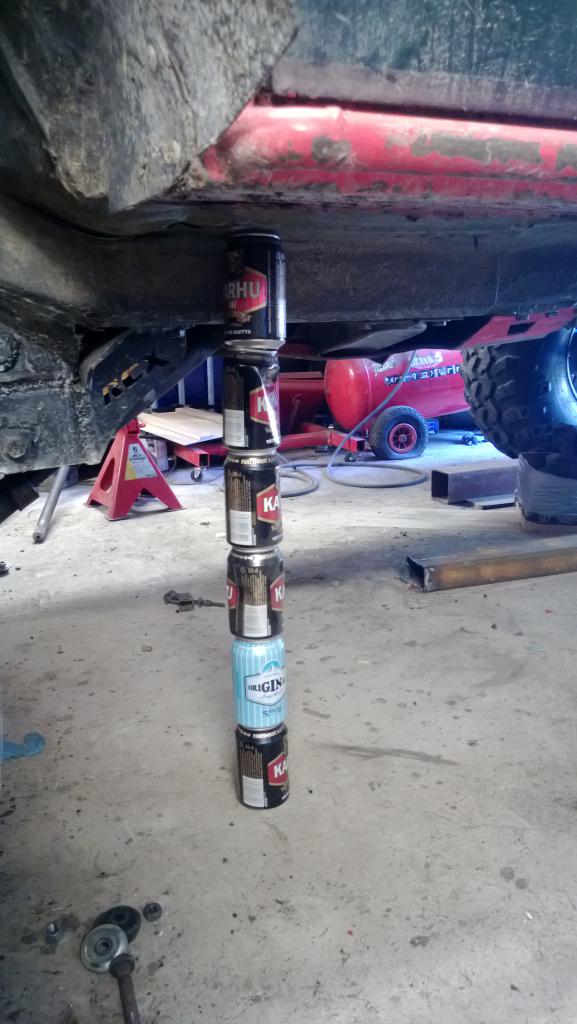 Täytyi teipata purkit toisiinsa, ettei kaatunut pino tuulessa. Etuakselin takana 9 tölkkiä, taka-akselin edessä 7 ja puoli.