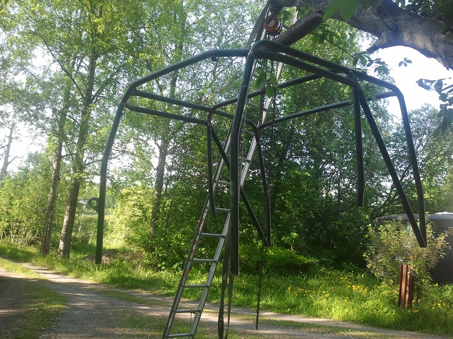 Seuraavaksi oli vuorossa kaarien nosto pois auton päältä lähinnä saumojen viimeistelyä ja maalausta varten. Kallellaan ollut puu + tikkaat tukena + ketjunosturi hoitivat tämän homman
