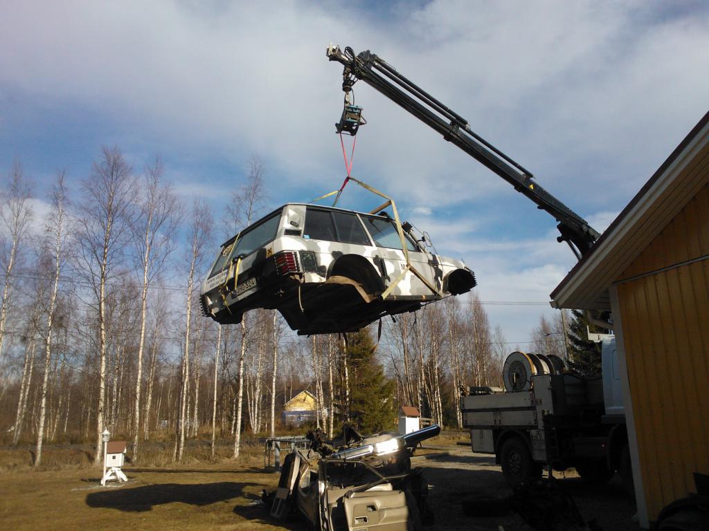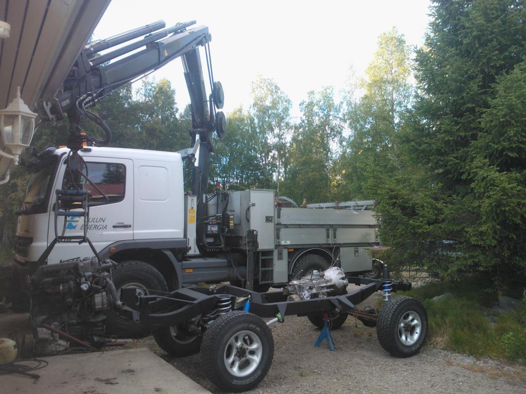 Akseleita tuossa mallailin uusilla puslilla ja taitaa olla pikkasen liian löysät tähän alustaan, ainakin osa niistä. Tyhjillä akseliputkilla vähän vääntelin... Ja takana ois vääntyny vielä lisääki mutta ku tuo lattia on niin lähellä. Etunen ei hirmusti väänny tyhjänä mutta roikkuu lattiassa jota se ei kyllä tehny vanhoilla puslilla Ja koriki pääsi nyt lähemmäs työmaata, piitää käyttää kaikki posket auki ja kattoa mitäs se on reilun vuoden seisonnassa syöny. Äkki vilkasulla näyttäs ettei mitään isompaa oo tulossa mutta koskaan ei tiiä. Ja nosto oli vähintäänkin virallinen Tuo romukasa tuossa on kakkos rojektin(broncon) toinen varaosa-auto oottamassa viimestä kyytiä pois.
