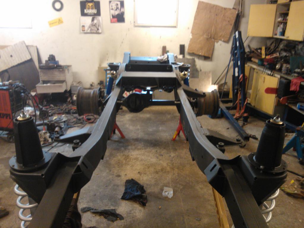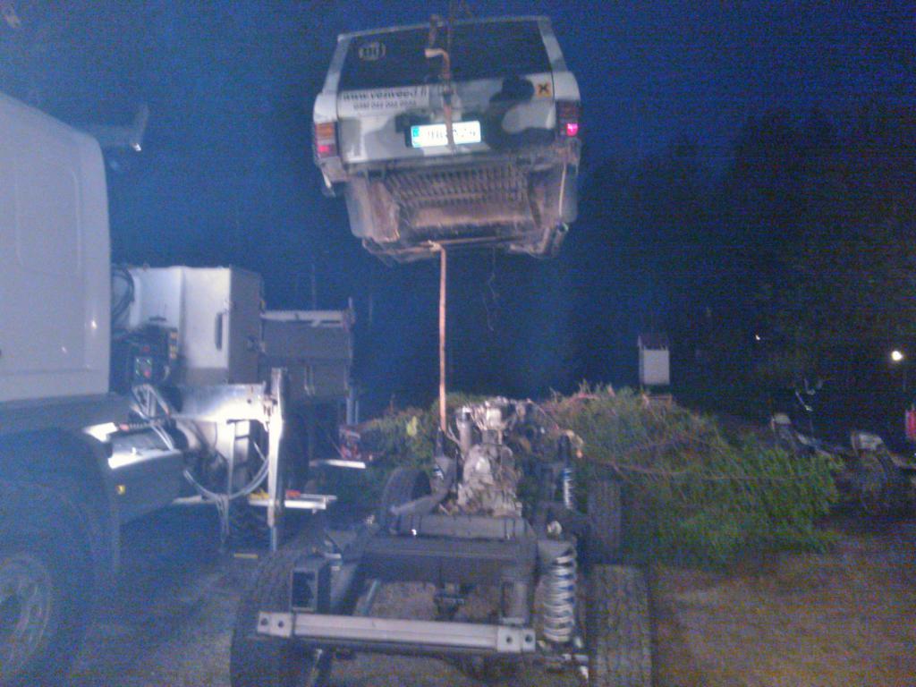 Oli tällä kertaa vähän jämympi moottori nostin Ja koppa menee Siihen se istu Ja pääsi jo talliinki niin jos vaikka kohta valmistus Ensin pitäs asennella ohjaus kilikkeet ja rankentaa panhardin kiinnitykset sen jälkeen oiski vaan pelkkää kasausta ja ihan vähän hitsuutteluja koriin...