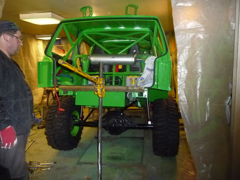 Shrek sai tänä iltana jalat alleen. Muutama juttu alkoi vaivaamaan kun tunkkailtiin joustoja ja pällisteltiin asennustyön tuloksia. Olisko kuitenkin 16" tikut ollut taakse paremmat että saisi ulosjoustoa enemmän, ekassa kuvassa akseli maksimit ulkona. Etupäässä on Rubicon Expressin 5,6" vieterit ja ainakin ilman etupäähän tulevia osia näyttää keula aivan liian korkealta. Kori on saman levyinen kuin edellinen versiokin ja raideleveys 5cm kapeampi, mutta silti pyörät näyttää tulevan hullusti kaarista ulos