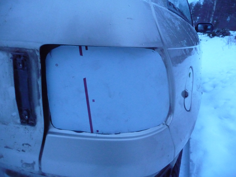 Vanhasta takansuojaritilästä syylärille suojaa ja painokäytöstä hylätystä alumiinilevystä peitettä takavalojen reikiin. Just kymmenen täyttänyt junnari tuntui saavan onnistumisen elämyksiä aiheesta, eiköhän se kohta rakenna ton miun Jeepinkin valmiiksi
