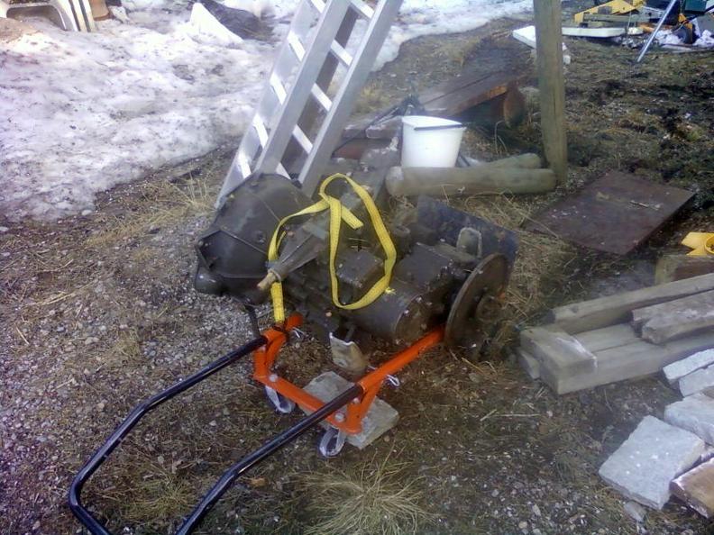 Vaihdelaatikko, eli växellåda löytyi lumien lähdettyä. Tuli säilöttyä se huolellisesti pihan perälle multapedille... moottorikoppa sentään oli päällänsä.