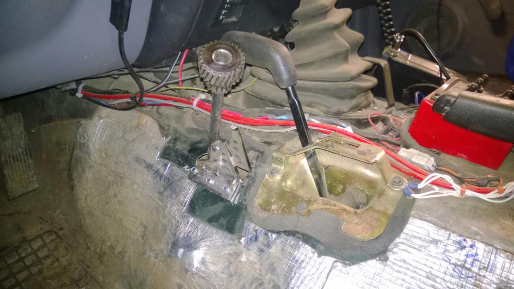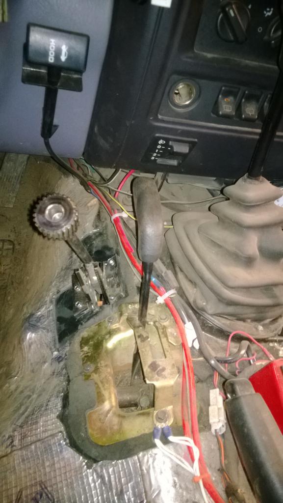 Seuraavaksi kuskinpenkki jalustoineen pois paikoiltaan ja rälläkällä kardaanitunneliin reikää jakolaatikkoa varten.