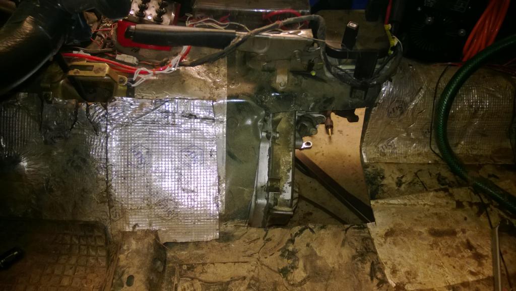 Seuraavaksi kuskinpenkki jalustoineen pois paikoiltaan ja rälläkällä kardaanitunneliin reikää jakolaatikkoa varten.