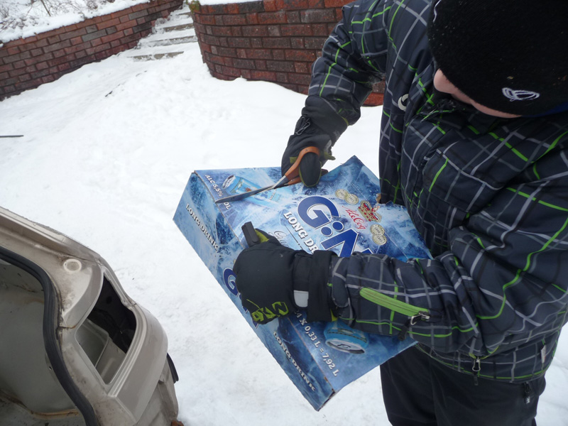 Vanhasta takansuojaritilästä syylärille suojaa ja painokäytöstä hylätystä alumiinilevystä peitettä takavalojen reikiin. Just kymmenen täyttänyt junnari tuntui saavan onnistumisen elämyksiä aiheesta, eiköhän se kohta rakenna ton miun Jeepinkin valmiiksi
