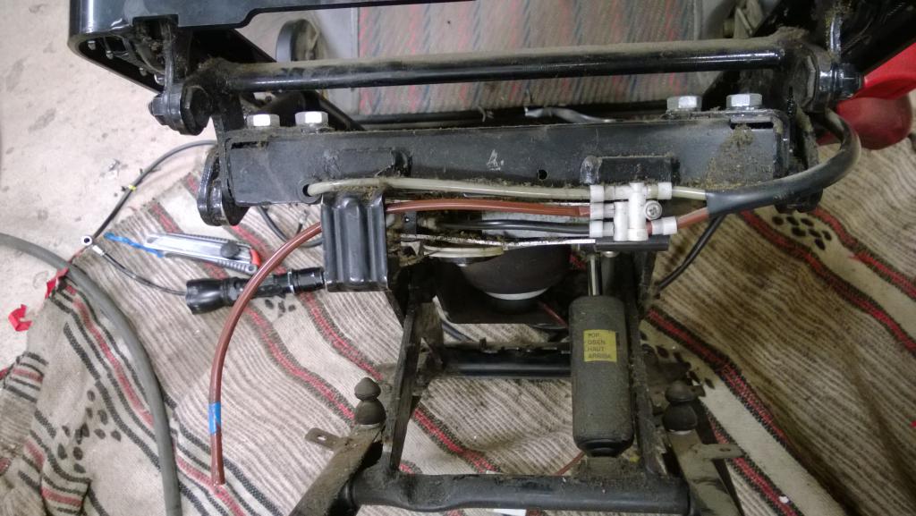 puraseen aika raskaasti tuota penkkiä, ilmapussi on ehyt, nesteiskari on ehyt, paineen/korkeudensäätökytkin näyttäs toimivan, mutta muuten aikalailla ottanu siipeensä. Monesta paikasta muoviset liittimet poikki, ilmapussista tulevan ilmaletkun päässä oleva mekaaninen kytkin/venttiili näyttäs olevan rikki koska siitä puuttunee ainakin yks jos ei kaksikin letkua, pneumaattisen aktuaattorin(?) toinen letku eli ilmeisesti kuvissa oleva irtonainen ruskea? on poikki liittimestä, mustaan rajaan (johon musta letku menee haarottimesta)? osuvat muoviosat kärsineet, jne. Eli pitäs aika reippaasti uusia osia... Saapa nähä. Toimiskohan tuo välttävästi jos unohtas nuo kaikki hienostelut tuosta paineilman säädöstä, kytkis vain suoran ilman tuohon ilmapussiin ja väliin normaali mekaaninen paineensäädin? Pystyskö tuolla säätämään penkin joustoa ja korkeutta välttävästi vai kannattaako unohtaa koko ajatus alkuunsa ja etsiä uus penkki tai muuttaa tuo jäykäks penkiks kokonaan? |