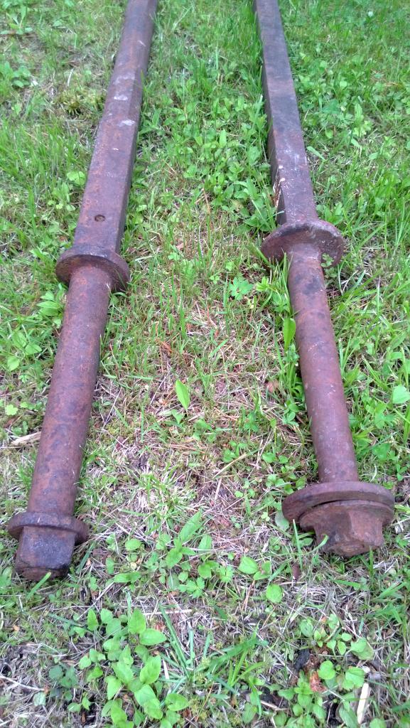 Hevoskärryn akselitko?Kellään hajua onko nämä hevoskärrin vai minkä akselit? Toinen neliskulmio koko matkalta paitsi päistä tietenkin pyöreät. Toisen kohdalla näyttäisi lehtijousien kohdalla olevan neliskanttiset muuten kahdeksan kulmainen?