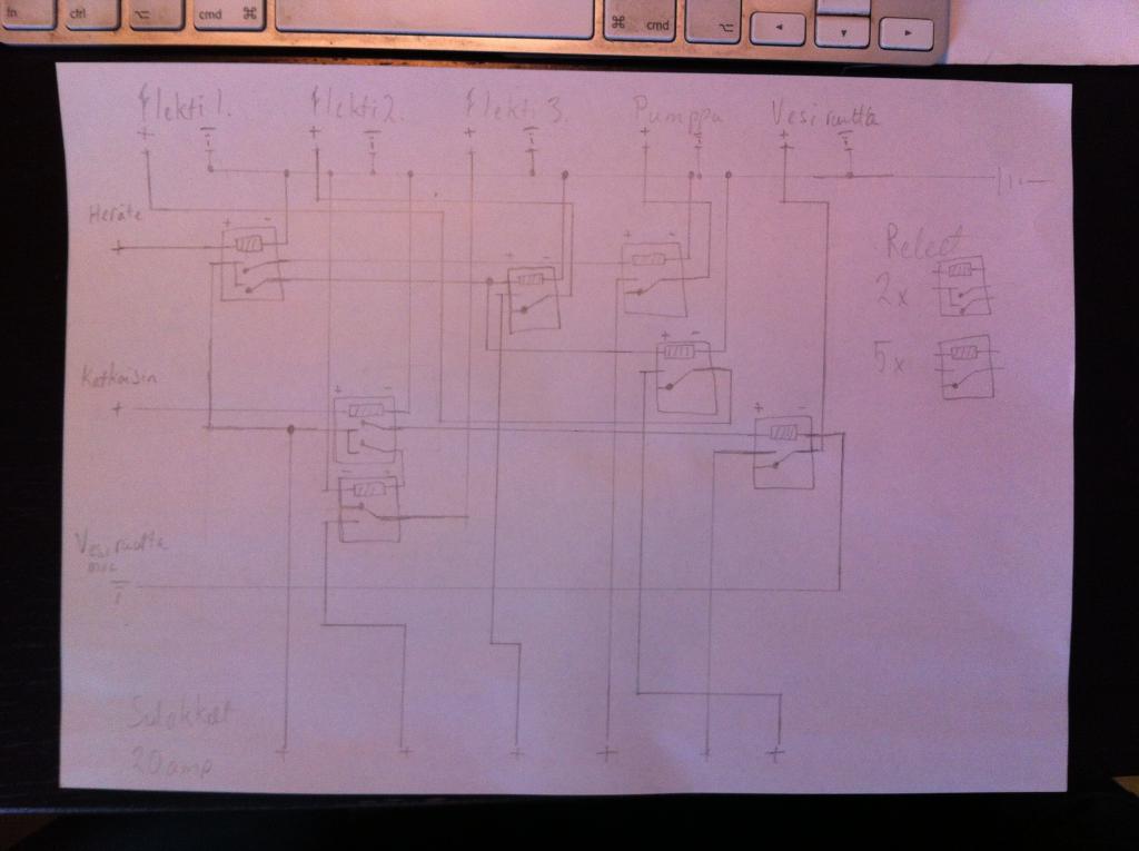 Patrollin sähköihin hiukan päivitystä. Saa nuo relee ja muut sulakkeet sisätiloihin, niin luulis olevan suojassa. Oli noi sadekelit hiukan turmiolliset, kun kärähti kaksi relettä ja varmaan puoli metriä johtoa